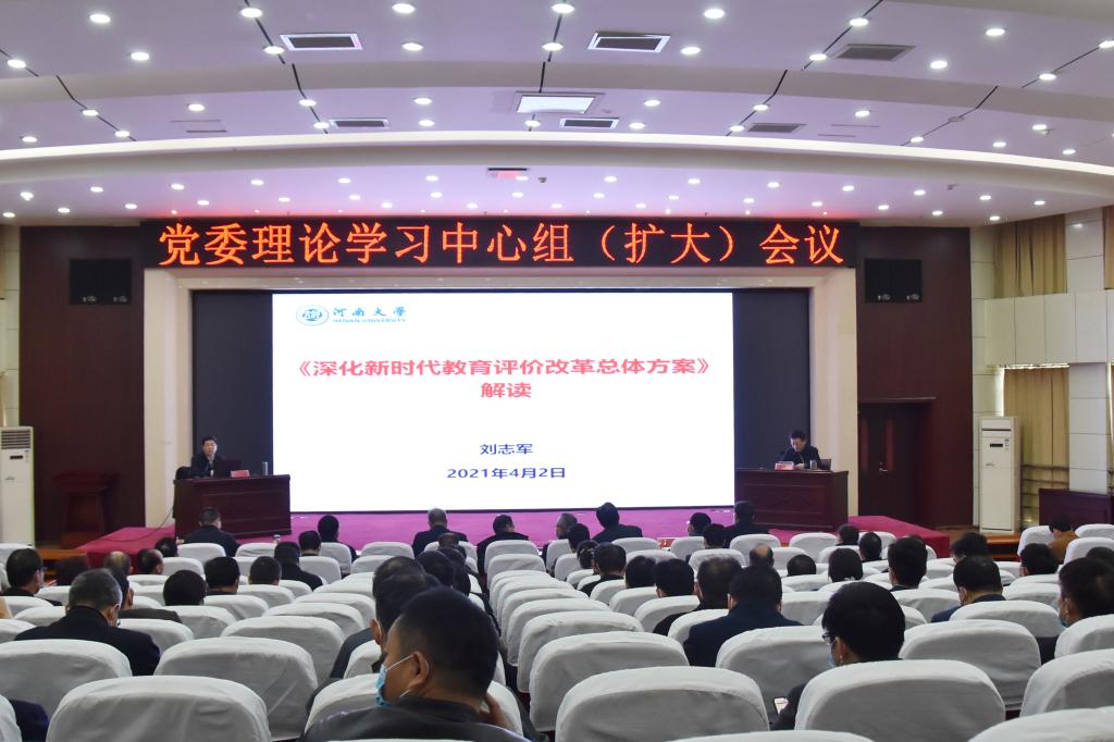 4月2日下午,校党委理论学习中心组扩大学习会在行政楼308会议室举行,邀请河南大学党委副书记、副校长、博士生导师刘志军教授,就《深化新时代教育评价改革总体方案》作辅导报告。在校校领导及全体处级干部参加了会议。