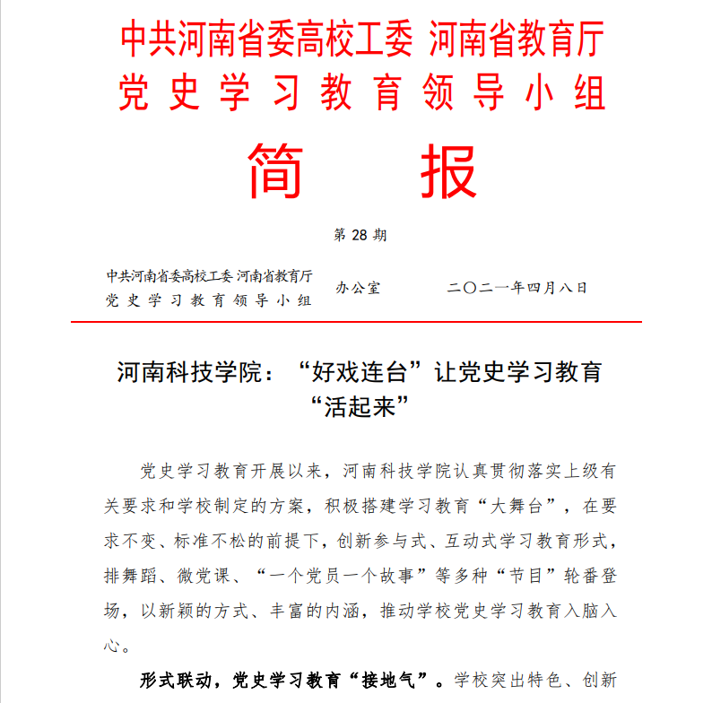 党史学习教育开展以来,我校认真贯彻落实上级有关要求和《河南科技学院党史学习教育工作方案》,在要求不变、标准不松的前提下,创新参与式、互动式学习教育形式,开展了党史专题书展、“国脉文脉,以邮筑梦”献礼建党百年、《没有共产党就没有新中国》排舞、党史知识竞答、课前5分钟微党课等多种活动,以新颖的方式、丰富的内涵,推动学校党史学习教育落地落实、入脑入心。学校及时整理材料、总结经验做法,上报省教育厅,被中共河南省高校工委、河南省教育厅党史学习教育领导小组办公室简报和省教育厅网站采用。