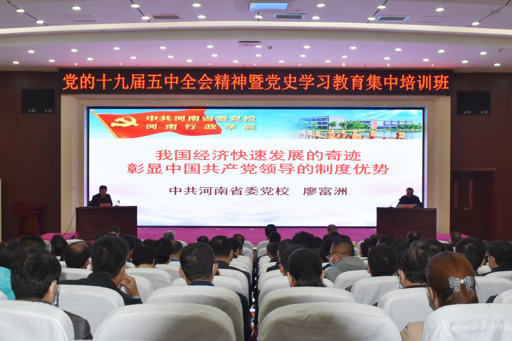 为进一步深入学习贯彻党的十九届五中全会精神,推进党史学习教育,4月22日上午,按照我校党的十九届五中全会精神暨党史学习教育集中培训班日程安排,省委党校副校长廖富洲教授应邀来校做专题辅导报告。校党委书记周志远,副校长曹国杰、贾积身等出席报告会。全校处级干部200余人参加了报告会。报告会由校党委副书记宋亚伟主持。