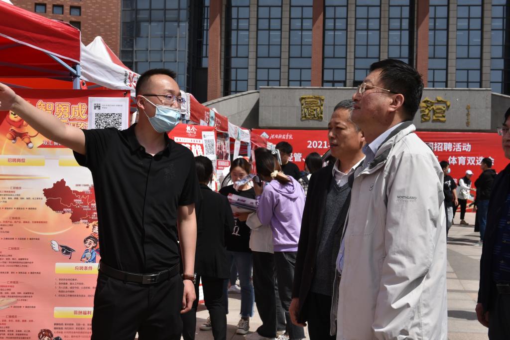 4月28日上午,由招生就业处、新乡市人力资源和社会保障局主办,经济与管理学院、艺术学院、文法学院、教育科学学院、数学科学学院、外国语学院和体育学院联合承办的2021年“纳贤•助航”系列校园招聘会——师范类、经济管理类双选会在启智广场举行。副校长何松林在相关单位负责人的陪同下莅临现场视察指导工作。