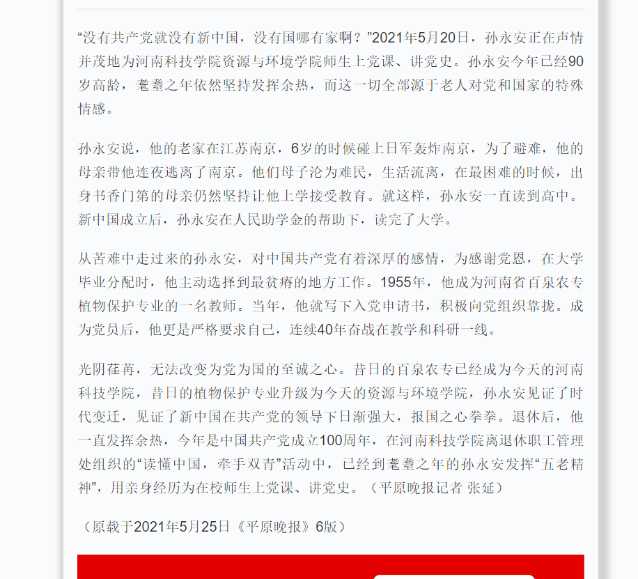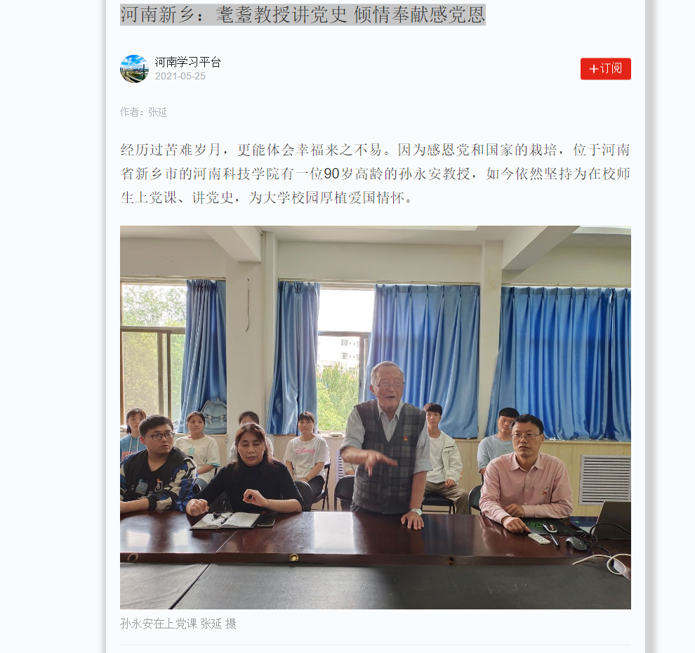 近日,【学习强国】平台以“耄耋教授讲党史 倾情奉献感党恩”为题,报道我校资源与环境学院(原植保系)原主任、退休教授孙永安老师为我校师生讲党课的事迹。