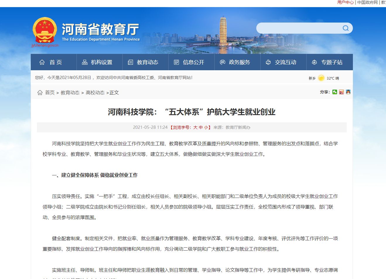 河南科技学院坚持把大学生就业创业工作作为民生工程、教育教学改革及质量提升的风向标和参照物、管理服务的出发点和落脚点,结合学校学科专业、教育教学、管理服务和毕业生状况等,建立五大体系,做稳做细做实做深大学生就业创业工作。