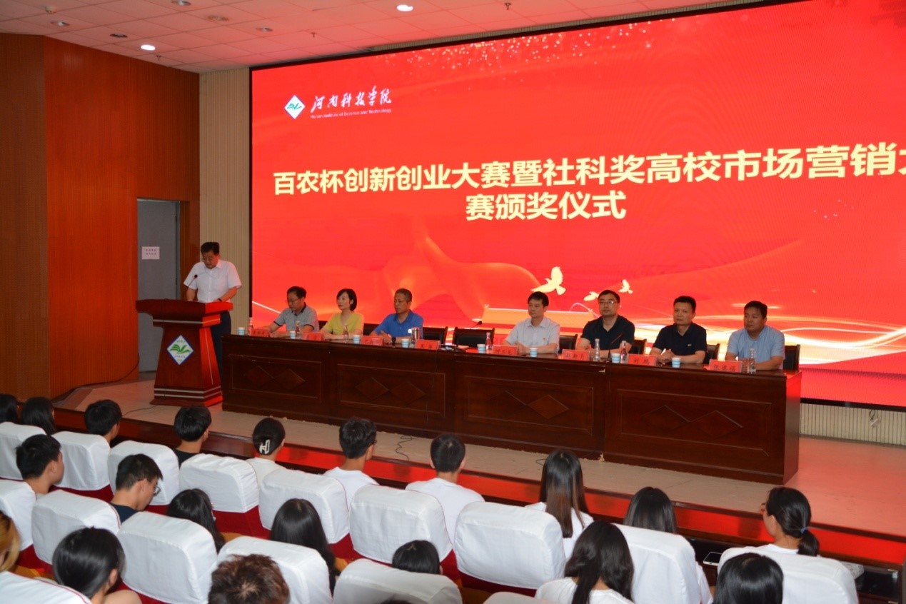 6月18日晚上,我校“百农杯”大学生创新创业大赛暨社科奖高校市场营销大赛颁奖仪式在图书馆一楼报告厅举行。校团委、教务处、招生就业处、资产经营管理有限公司、经济与管理学院、河南百农种业公司相关负责人以及400余名大学生参加了颁奖仪式。