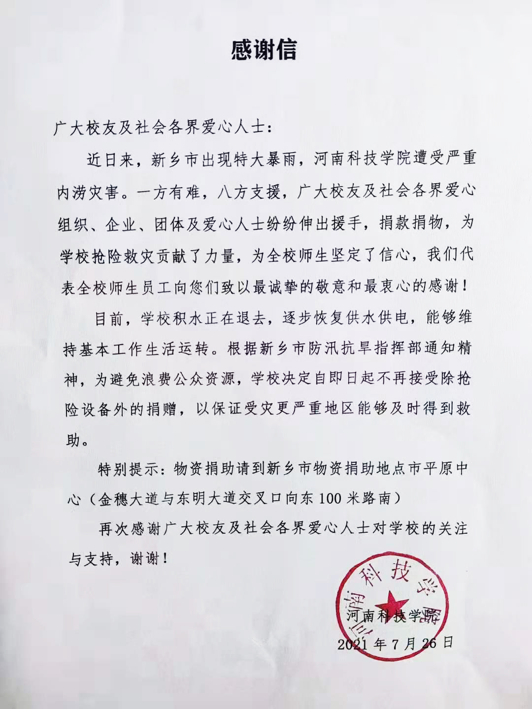 目前,学校积水正在退去,逐步恢复供水供电,能够维持基本工作生活运转。根据新乡市防汛抗旱指挥部通知精神,为避免浪费公众资源,学校决定自即日起不再接受除抢险设备外的捐赠,以保证受灾更严重地区能够及时得到救助。