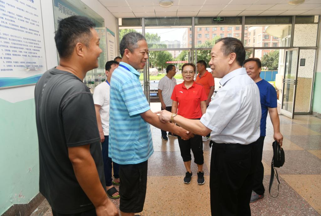 苗双虎先后到校医院、招生就业处、校团委、学生处、基建处、继续教育学院、后勤服务中心、保卫处和抗汛救灾办公室各工作组等14个单位看望坚持在岗工作的一线教职工。每到一处,苗双虎都认真询问同志们的工作进展情况和大家的生活现况,叮嘱大家坚持做好工作的同时,要保重身体,并询问大家工作、生活上还有哪些困难,有哪些需要帮助。