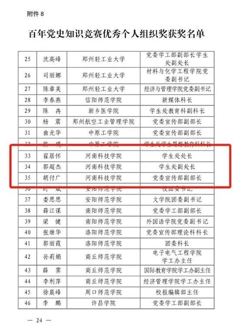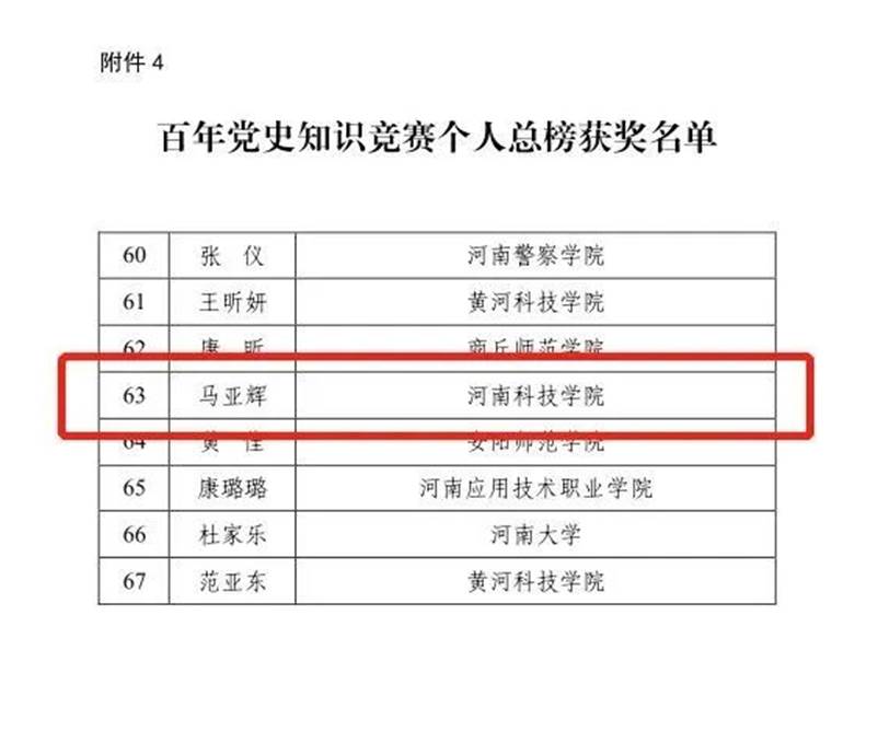 我校获百年党史知识竞赛本科组一等奖;我校教师翟居怀、郭超杰、胡付广分获百年党史知识竞赛优秀个人组织奖;马亚辉同学入选百年党史知识竞赛个人总榜获奖名单。