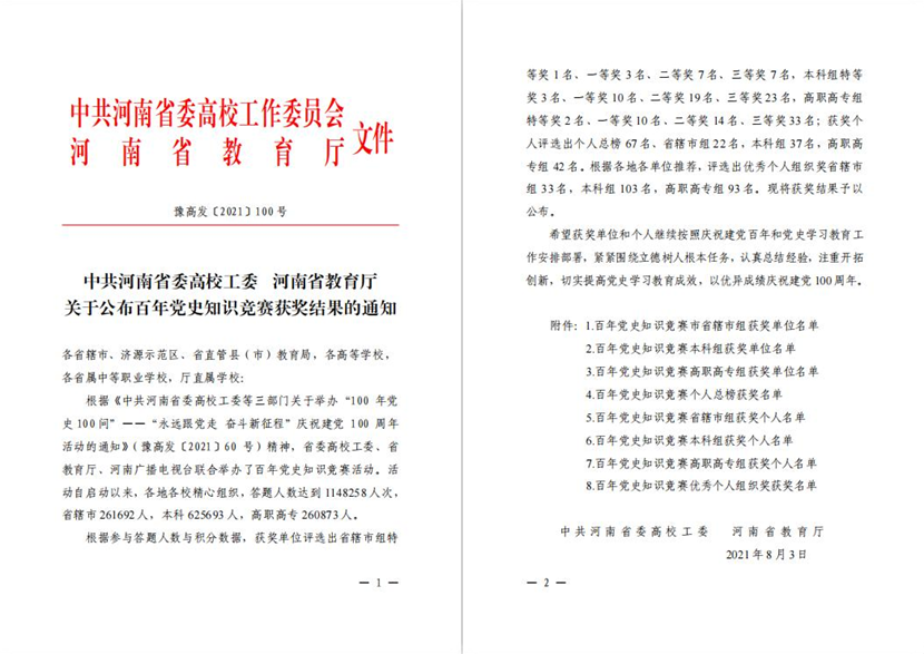 近日,中共河南省委高校工作委员会 河南省教育厅下发《关于公布百年党史知识竞赛获奖结果的通知》,我校榜上有名,获得多项荣誉。