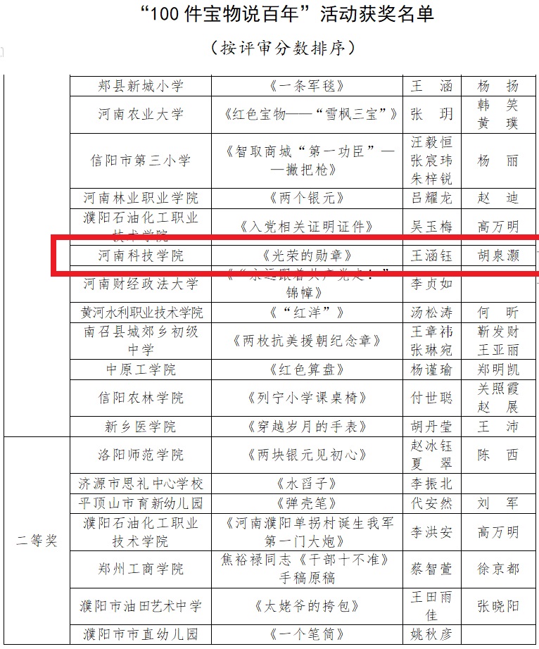 近日,中共河南省委高校工委 河南省教育厅河南广播电视台发布《关于公布庆祝建党100周年“100年党史100问”“100件宝物说年”“100校红色大闯关”获奖名单的通知》,我校荣获多项荣誉。
