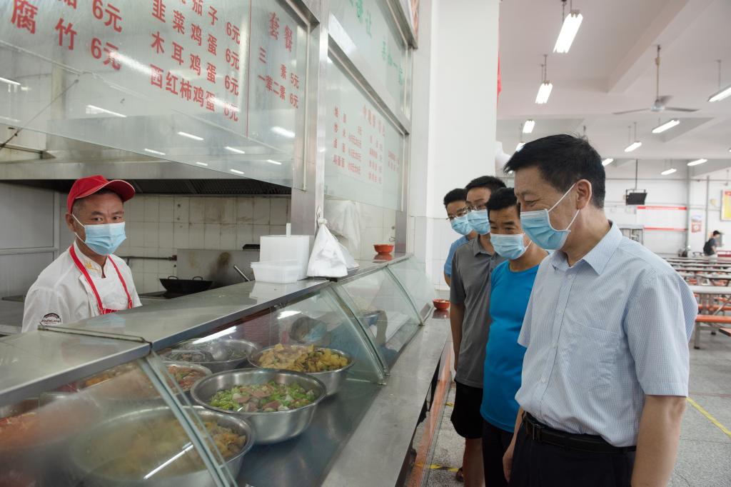 在学校大门,校领导一行查看了防汛物资和抗洪设备的准备情况。周志远指出,学校大门是防汛工作的重点区域,要及时关注雨情汛情,加强校园安全检查巡查,加大值守力量,切实做好做实校园防汛防灾工作。在餐厅,周志远重点查看了餐饮供应情况,要求保障好特殊时期的食材供应和饮食安全。