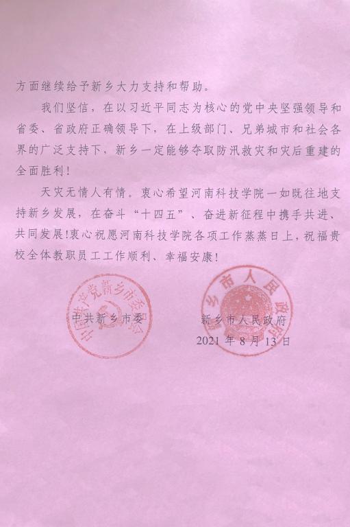 近日,我校收到中共新乡市委、新乡市人民政府发来的感谢信,感谢我校自7月17日新乡市遭遇特大暴雨后,积极投身地方防汛救灾一线,安置卫辉受灾群众,组建结对帮扶工作组,“一对一”对口帮扶卫辉市纸坊村,以实际行动分担地方政府压力,展现学校担当。