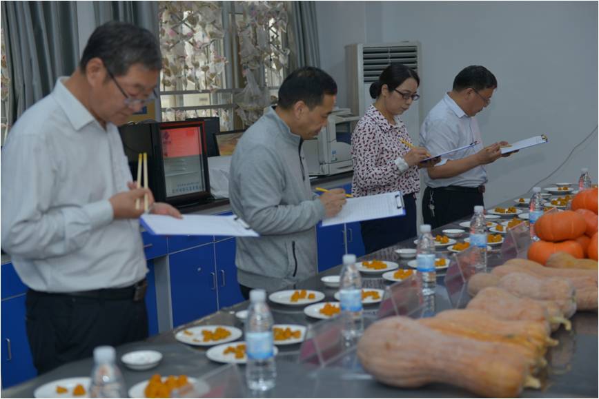 我校副校长贾积身致辞,代表学校对各位来宾表示欢迎和感谢。随后,他围绕历史沿革、学科优势以及特色专业等方面介绍了学校的基本情况。南瓜研究团队负责人李新峥介绍了南瓜种质资源创新与新品种选育的有关情况,团队成员逐一汇报了4个南瓜新品种的品比试验和区域试验结果。专家们对照《南瓜口感品质评分表》,对百蜜系列南瓜新品种进行了口感品质鉴定评价。