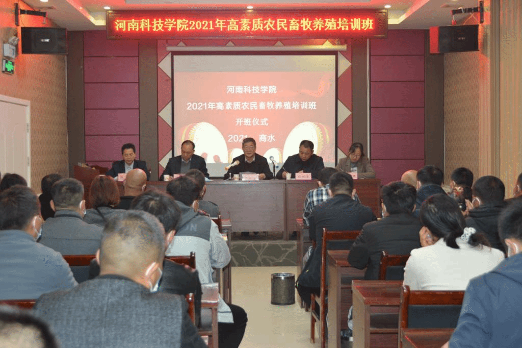 10月27日上午,我校2021年高素质农民培育畜牧养殖培训班在商水县百汇商贸宾馆举行。我校副校长贾积身,商水县农业农村局局长赵社会,学校科技处有关负责人,以及来自商水县各村镇的养殖企业负责人、养殖大户、农村致富带头人和培训教师代表等50余人参加了开班仪式。