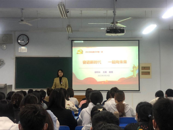 3月14日下午,副校长王霞在6号楼104教室,为文法学院学生讲授“开学思政第一课”。