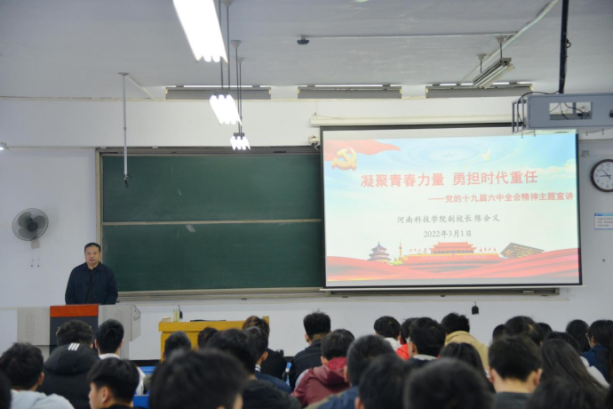 陈合义以《凝聚青春力量 勇担时代重任》为题,以学习贯彻十九届六中全会精神为主线,从《中共中央关于党的百年奋斗重大成就和历史经验的决议》的主要内容、特色亮点以及青年学子如何学习践行等三个方面,对十九届六中全会精神进行了深入解读。 课程融入学校涌现出的抗疫先进事迹等内容,引导同学们立大志、明大德、成大才、担大任,在建设社会主义现代化强国,实现中华民族伟大复兴的伟业中贡献青春力量。