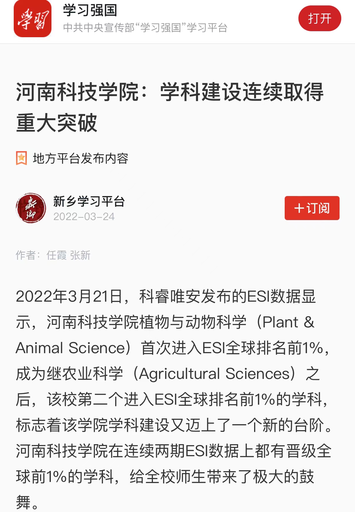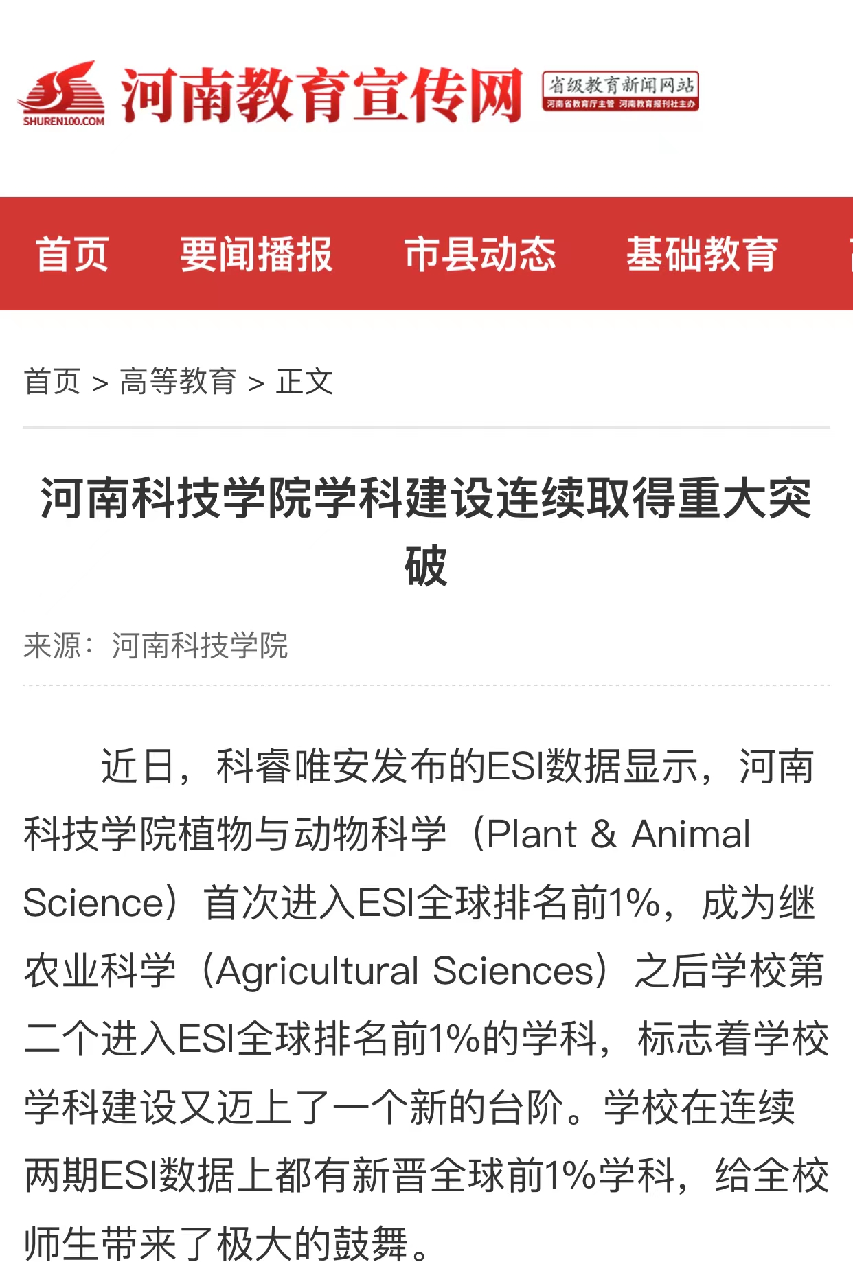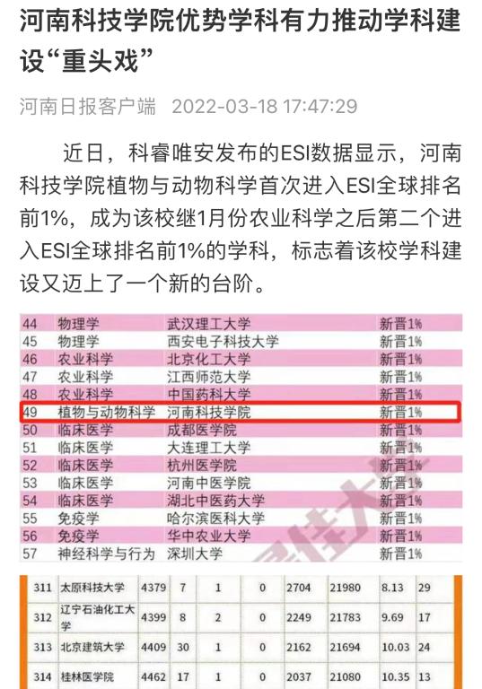 科睿唯安发布的ESI数据显示,我校植物与动物科学首次进入ESI全球排名前1%,成为继1月份农业科学之后第二个进入ESI全球排名前1%的学科,标志着我校学科建设又迈上了一个新的台阶。