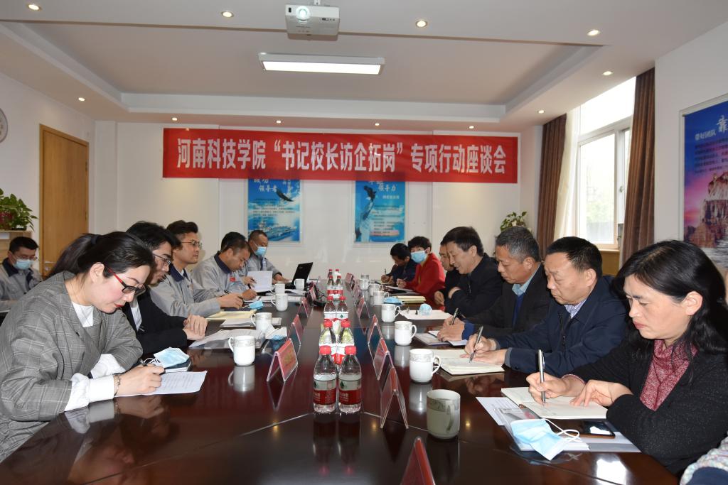 为贯彻落实《教育部办公厅关于开展全国高校书记校长访企拓岗促就业专项行动的通知》要求,4月14-15日,校党委书记周志远带领招生就业处、生命科技学院、经济与管理学院、机电学院、化学化工学院、马克思主义学院等单位负责人,先后到河南科隆集团有限公司、新乡市海滨药业有限公司、河南高远公路养护设备股份有限公司、新乡艾迪威汽车科技有限公司等4家新乡市高新区企业开展走访考察活动。