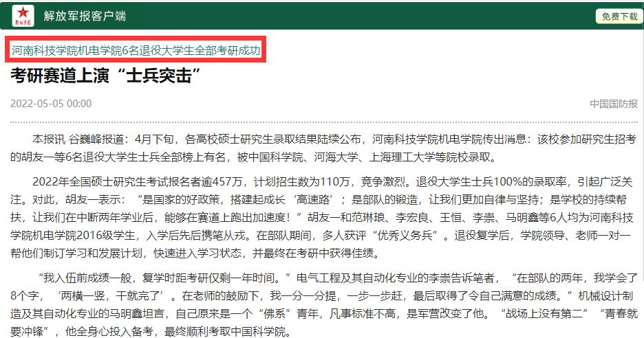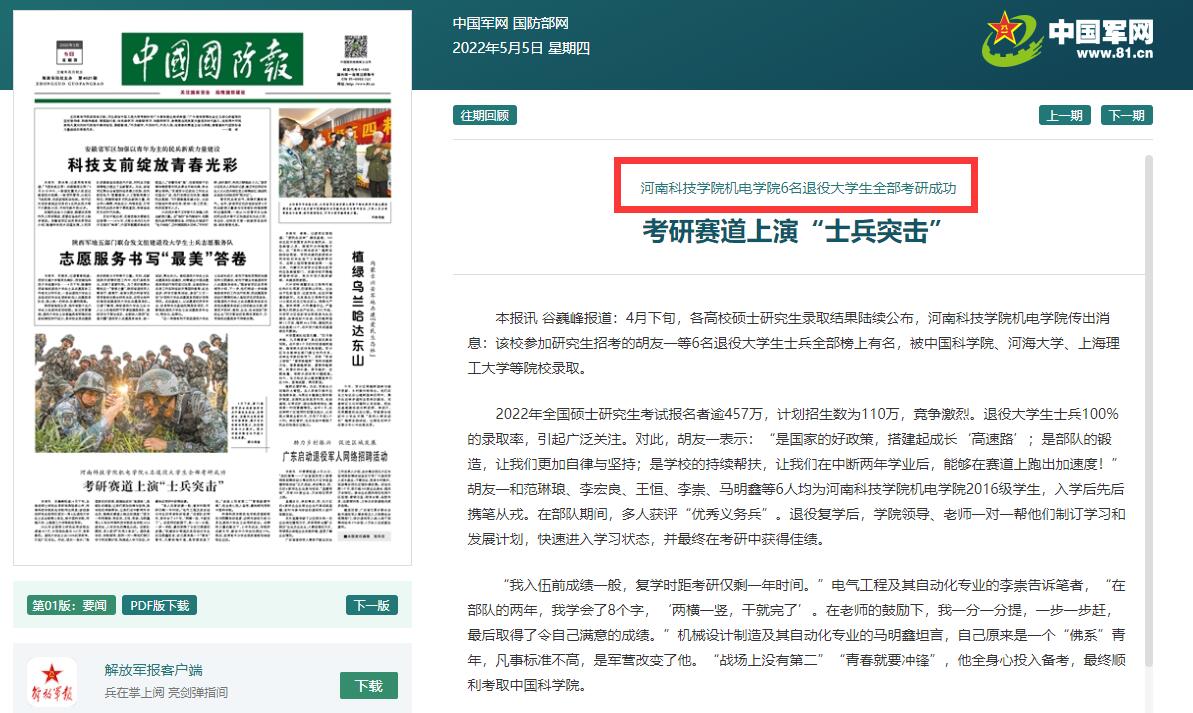 5月5日,《中国国防报》《解放军报》以“考研赛道上演‘士兵突击’”为题,对我校机电学院6名退役大学生全部考研成功的事迹进行了报道。