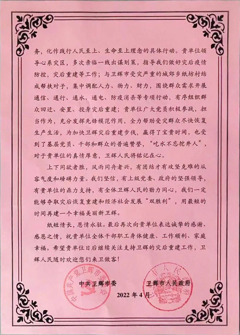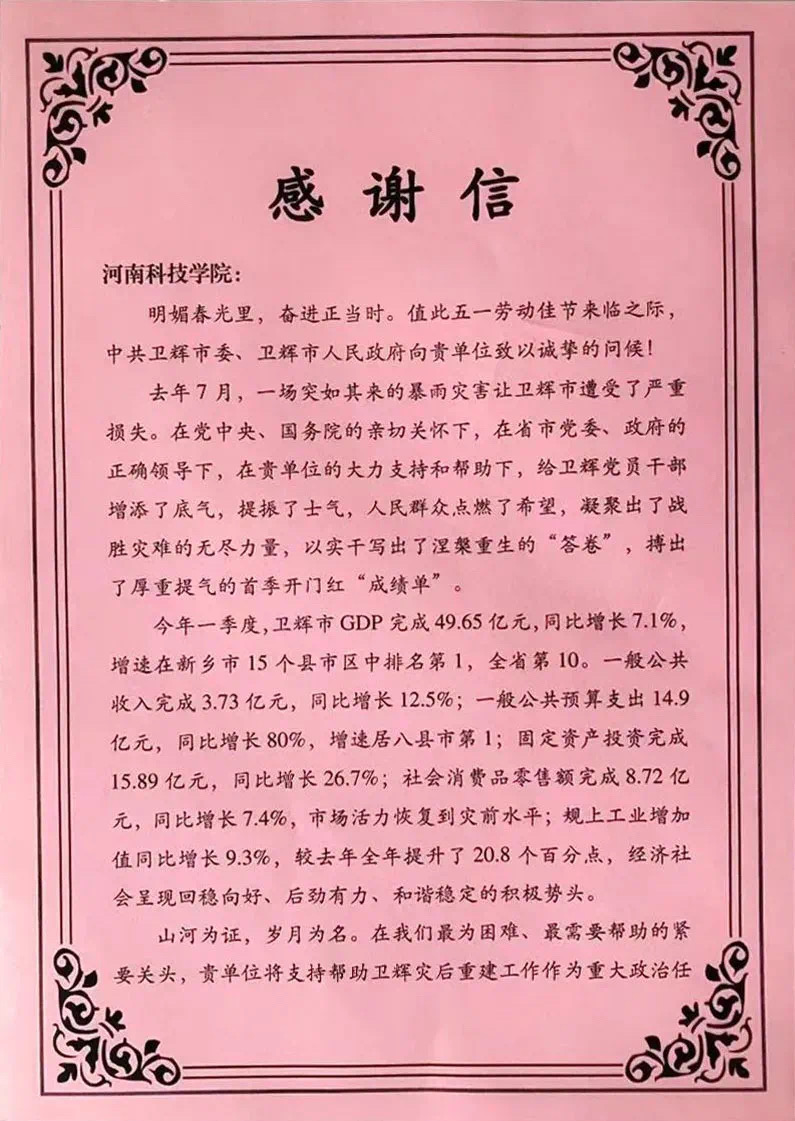近日,我校收到中共卫辉市委、卫辉市人民政府发来的感谢信,感谢我校自去年7月暴雨灾害以来,对卫辉市的大力支持和帮助。学校对提振士气,点燃人民群众的希望,凝聚战胜灾难的无尽力量起到了积极作用,助力卫辉以实干写出了涅槃重生的“答卷”,搏出了厚重提气的首季开门红“成绩单”。