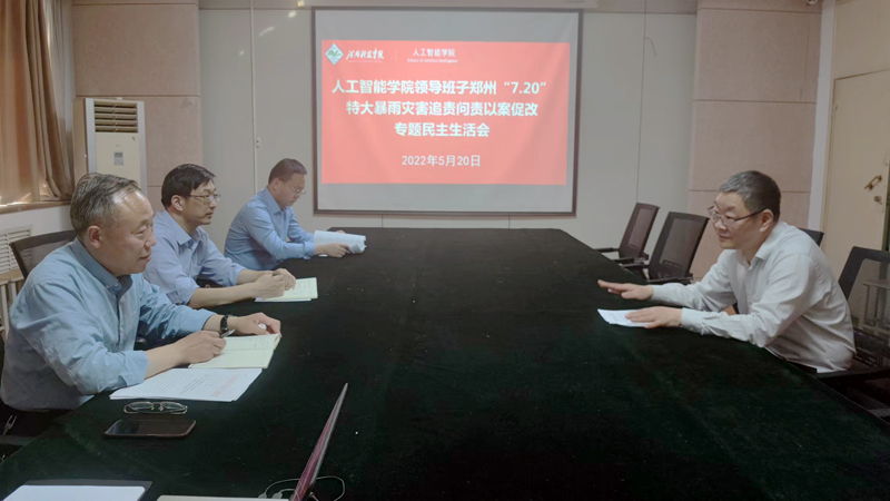 5月20日下午,人工智能学院在电教综合楼803会议室召开郑州“7·20”特大暴雨灾害追责问责以案促改专题民主生活会。副校长贾积身出席会议,学院党政领导班子成员参加会议。会议由人工智能学院负责人主持。