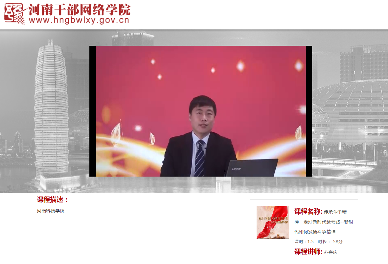 日前,由我校报送的《传承斗争精神,走好新时代赶考路——新时代如何发扬斗争精神》音像课程,成功入选河南干部网络学院课程库,作为全省广大干部开展精准学习的“必修课”。