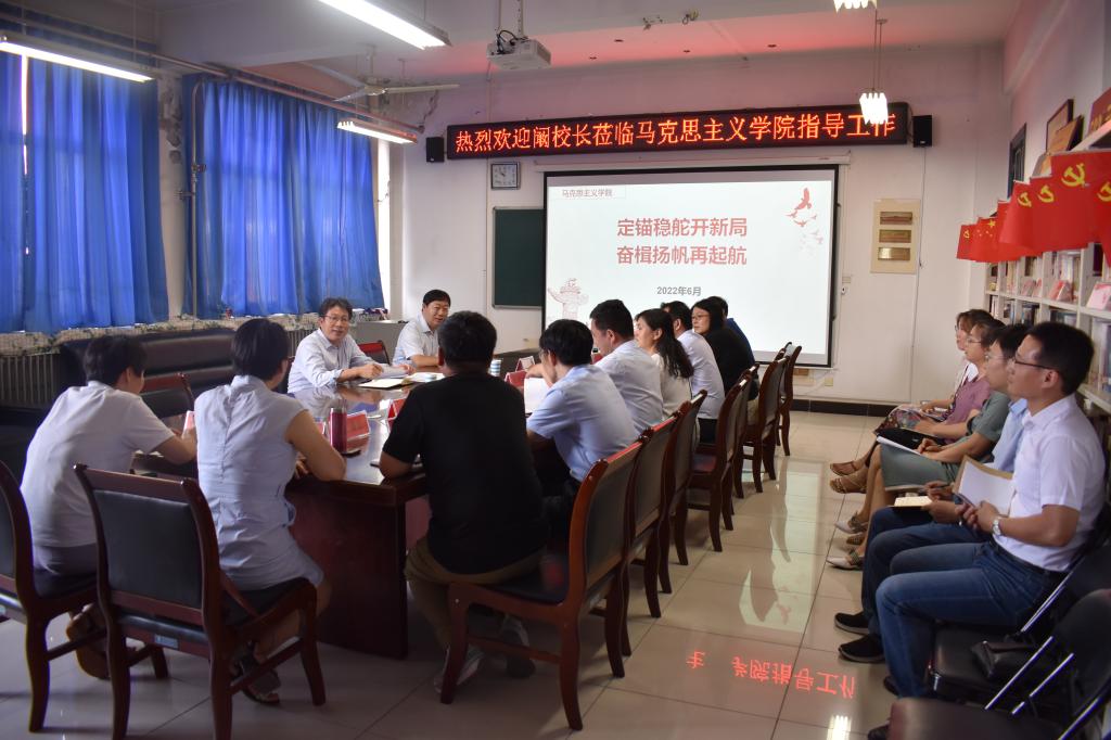 6月23日下午,校长阚云超在校长办公室相关负责人的陪同下,到马克思主义学院调研指导工作。学院党政班子成员、办公室人员、党支部书记、教研室主任和教师代表等16人参加了调研座谈会。