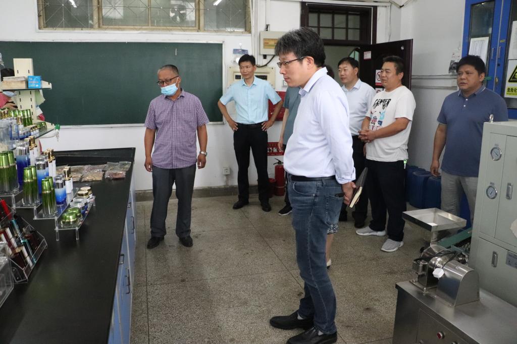 在制药工程实验室实地,阚云超听取科研负责人利用天然植物研发化妆品的情况介绍,并与参研人员探讨产品的市场推广前景。学院负责人围绕学院概况、工作成绩、“十四五”发展规划、存在问题等进行了详细汇报。阚云超与参会人员就加强学科建设、人才引进、教育教学、科学研究及学院发展等问题进行了深入交流。