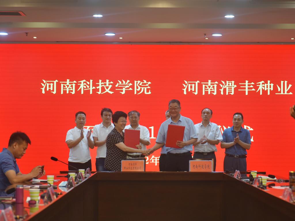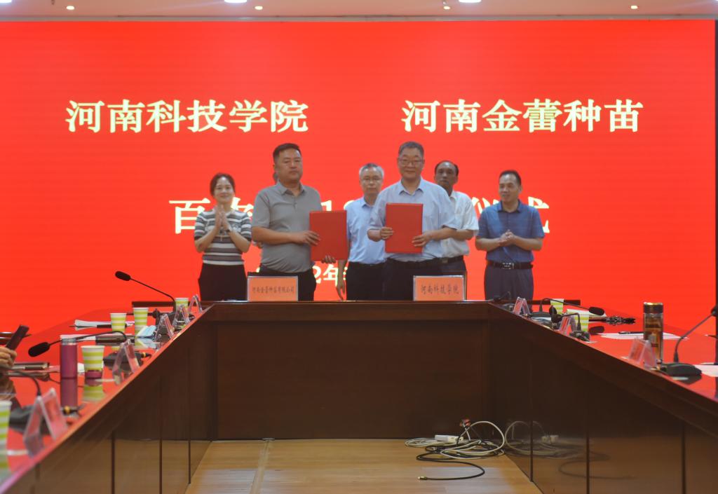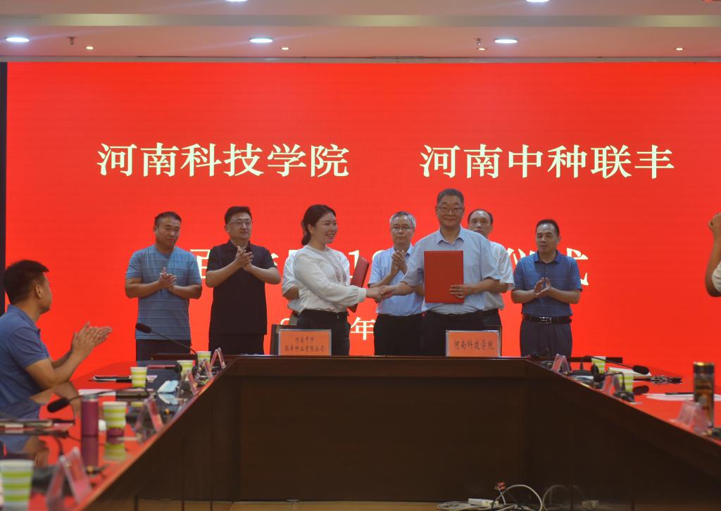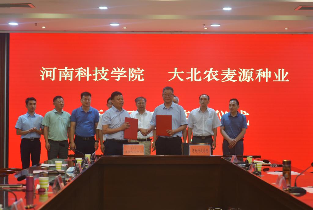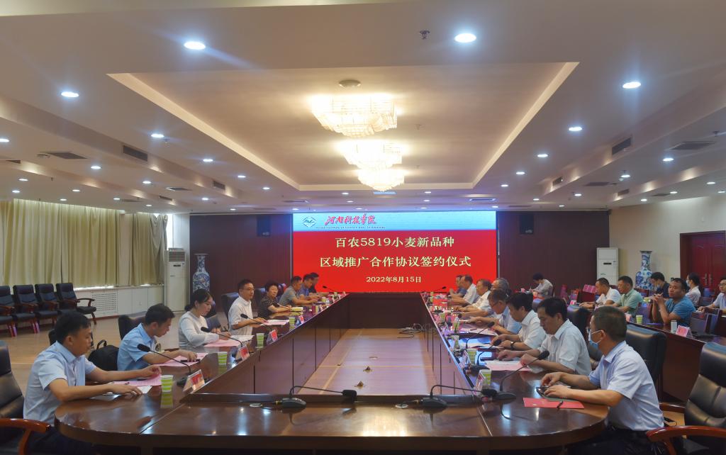 8月15日上午,我校与大北农安徽麦源种业科技有限公司、河南滑丰种业科技有限公司、河南中种联丰种业有限公司、河南金蕾种苗有限公司等四家公司在校行政楼206会议室举行“百农5819”小麦新品种区域推广合作协议签约仪式。校领导宋亚伟、贾积身,大北农丰度高科种业有限公司董事长王石、大北农安徽麦源种业科技有限公司总经理孙善超、河南滑丰种业科技有限公司董事长赵秀珍、河南中种联丰种业有限公司董事长刘丹丹、河南金蕾种苗有限公司副总经理李瑞坤出席仪式,科技处、生命科技学院相关负责人,茹振钢教授及小麦中心团队成员参加仪式。