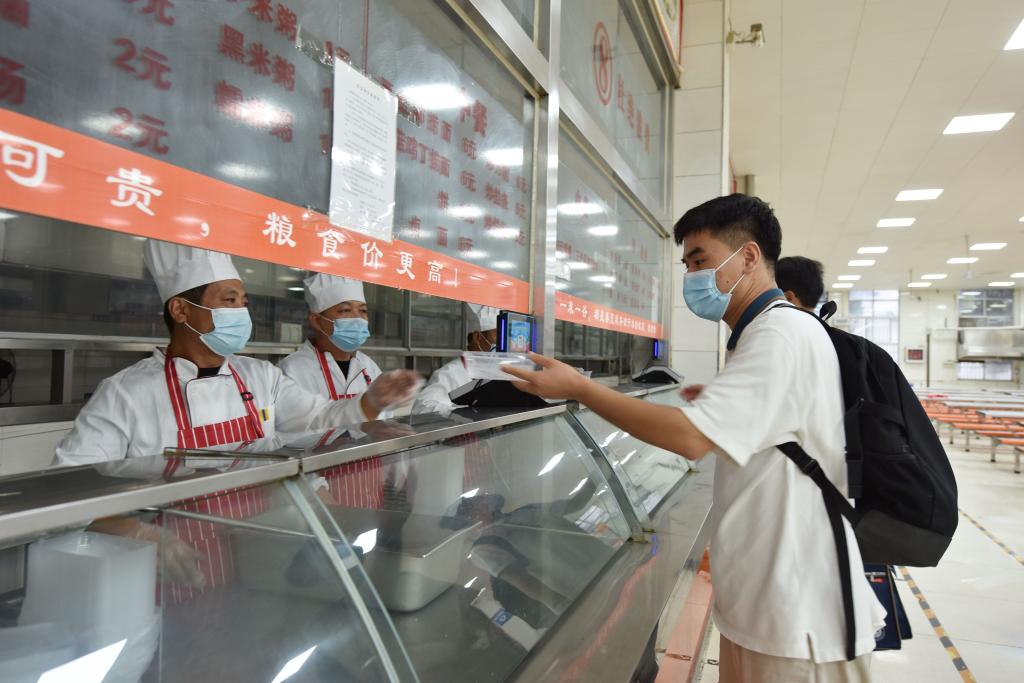 此次演练包含学生入校报到、教室上课、餐厅就餐、返寝、发热处置、确诊处置、群体性心因性反应处置等环节。在学生返校报到演练现场,学生入校前进行消杀、测温、身份验证后,进入校园办理报到手续。在教室上课演练环节,学生经过消杀、测温后有序进入教学楼,教室严格消杀和通风,学生全程佩戴口罩,间隔就座。在餐厅演练环节,学生自带餐具,经洗手、测温、消毒后进入餐厅,有序购买餐食,带回宿舍就餐。宿舍演练中,设置了体温检查台和学生登记台,门口放置消毒液、酒精等物品,学生按照间距1米排队,体温测量正常后有序进入宿舍。