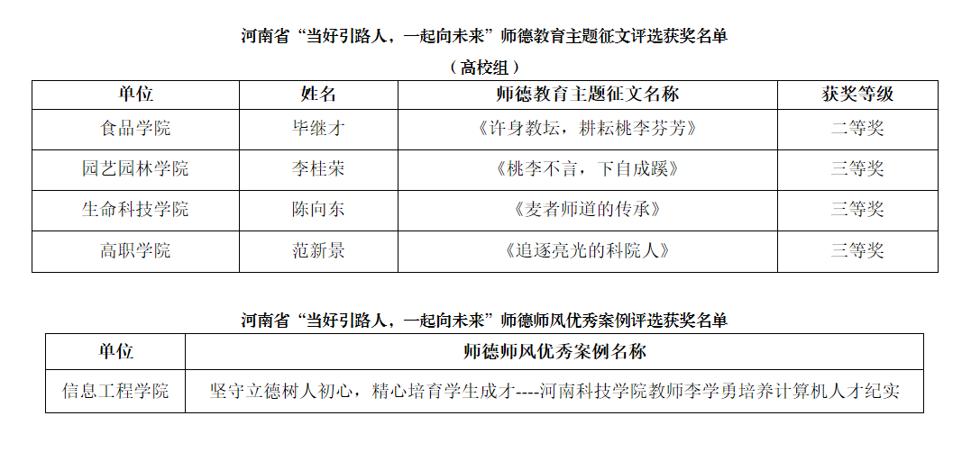 近日,河南省教育厅公布了“当好引路人,一起向未来”师德主题教育征文和师德师风优秀案例评选结果,我校选送的参赛作品获得师德主题教育征文二等奖1项、三等奖3项;获得师德师风优秀案例1项。