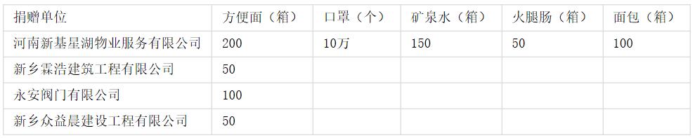 10月29日,河南新基星湖物业服务有限公司、新乡霖浩建筑工程有限公司、永安阀门有限公司、新乡众益晨建设工程有限公司等4家企业分别向我校捐赠防疫物资,为学校疫情防控工作提供了有力支持。