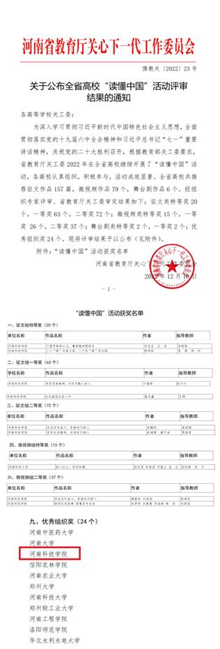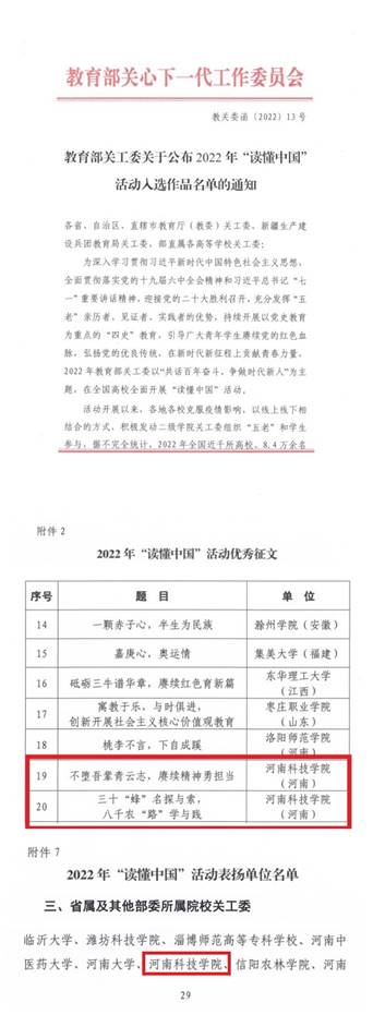 日前,教育部关工委、省教育厅关工委分别下发“读懂中国”活动评审结果通知:《教育部关工委关于公布2022年“读懂中国”活动入选作品名单的通知》(教关委函〔2022〕13号)、《关于公布全省高校“读懂中国”活动评审结果的通知》(豫教关〔2022〕23号)。我校关心下一代工作委员会报送的作品共获得部级优秀征文2篇(分别由研工部、文法学院报送),厅级征文组特等奖2篇、一等奖2篇、二等奖2篇,厅级微视频组特等奖1个、二等奖2个。我校关工委获得部级表扬单位、优秀组织奖。