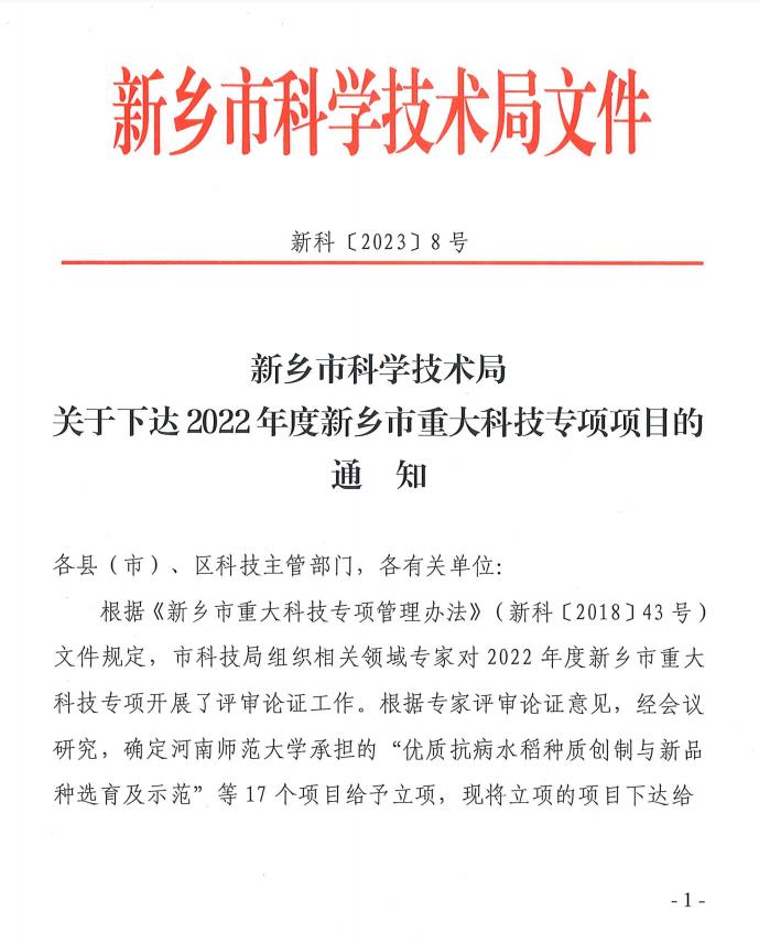 近日,新乡市科技局发布了《新乡市科学技术局关于下达2022年度新乡市重大科技专项项目的通知》(新科〔2023〕8号),全市共17个项目获批立项。我校生命科技学院王清连教授主持的《棉花精准高效育种技术体系的构建及突破性长绒棉新品种的创制与应用》和数学科学学院(河南省数字农业工程技术研究中心)贾积身教授主持的《基于籽粒镉低积累小麦培育的土壤重金属污染修复技术研发》两个项目获批立项。