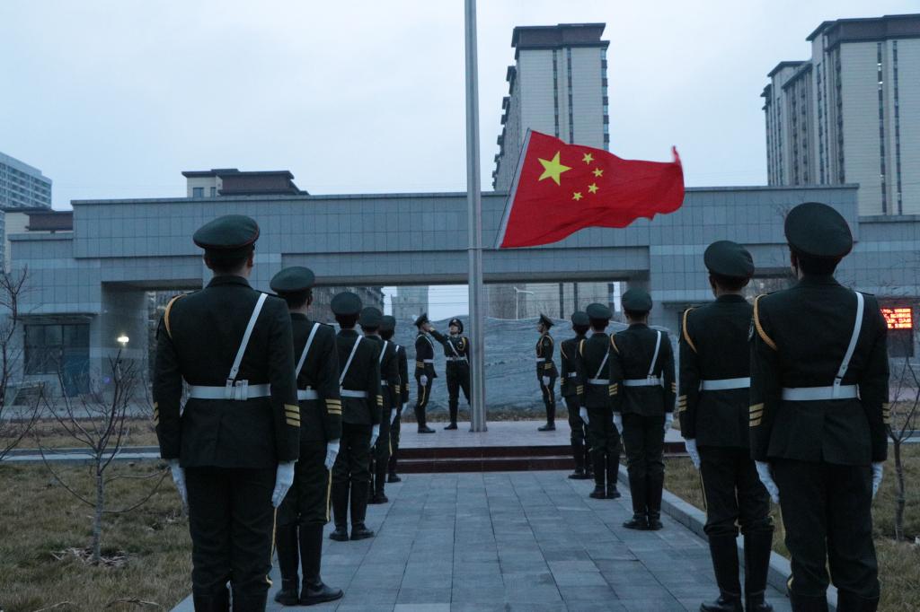 参加升旗仪式的师生列队整齐、精神饱满,伫立在升旗台前。七时整,升国旗仪式正式开始。在全体师生的注目礼下,国旗护卫队迈着铿锵有力的步伐护送国旗至升旗台。在雄壮的国歌声中,鲜艳的五星红旗冉冉升起,迎风飘扬。全体师生神情肃穆,面向国旗敬礼,向庄严的国旗表达最崇高的敬意。