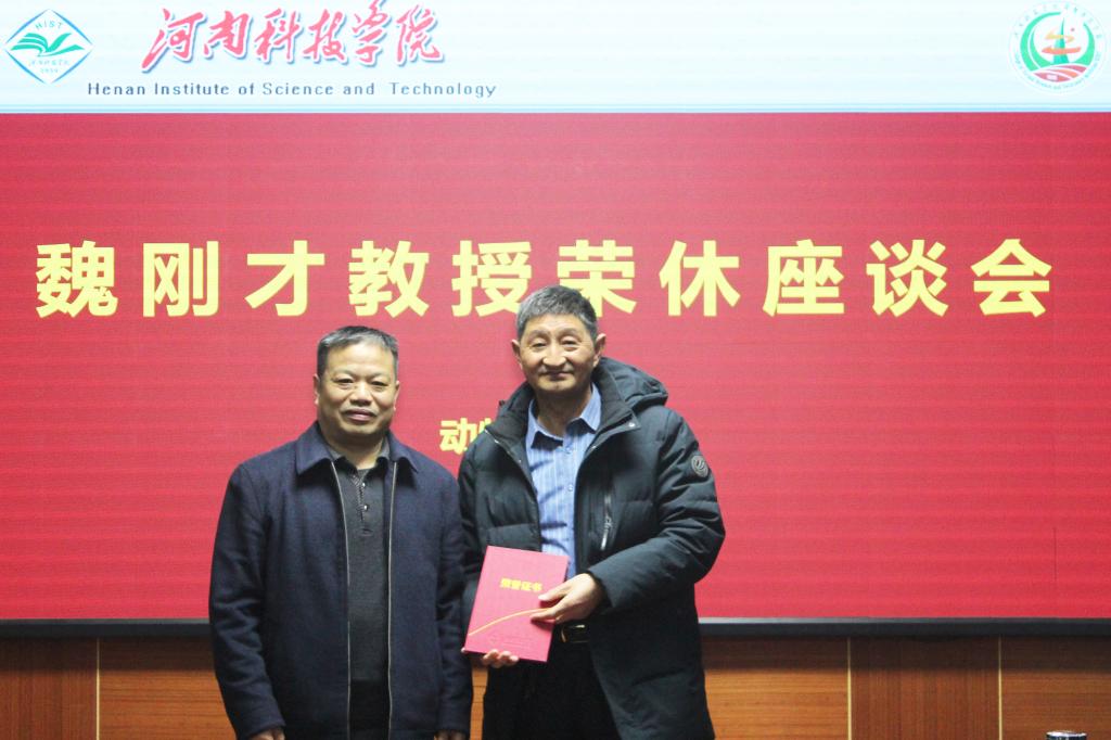 陈合义向魏刚才教授颁发荣休证书。动物科技学院负责人宣读魏刚才教授荣休通知。会议现场回顾了魏刚才教授对学院建设与发展作出的重大贡献。与会教师分享了魏刚才教授在工作中给予的帮助与鼓励,祝愿魏教授身体健康、万事皆顺。