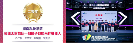 2月18日上午,第二十一届微软“创新杯”全球学生科技大赛中国区总决赛在郑州落下帷幕。在此次总决赛中,由人工智能学院王莹莹、宋浩华、张瑞阳(指导教师:蔡磊)等组成的“疫往无前战队-咽拭子自助采样机器人”项目组以河南赛区前三名的成绩进入中国赛区总决赛,荣获中国赛区优胜奖。
