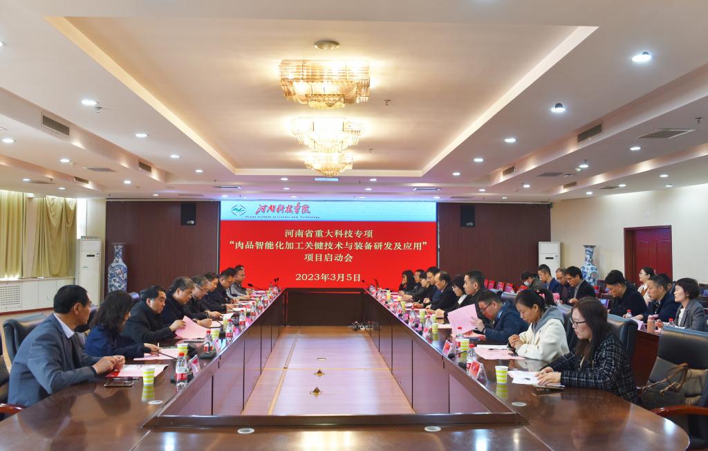 3月5日,河南省重大科技专项“肉品智能化加工关键技术与装备研发及应用”启动会在我校召开。省科技厅现代农业农村科技处处长李锦辉,新乡市科技局副局长郝科伟,项目咨询指导专家组组长、南京农业大学教授黄明,我校副校长贾积身出席会议。相关职能部门和食品学院负责人,项目主持人以及来自河南农业大学、郑州大学、河南科技大学、河南工业大学、郑州轻工业大学、河南牧业经济学院、河南双汇投资发展股份有限公司、河南九豫全食品有限公司、河南众品食业股份有限公司、河南御江食品股份有限公司的专家学者及课题组成员40余人参加了会议。