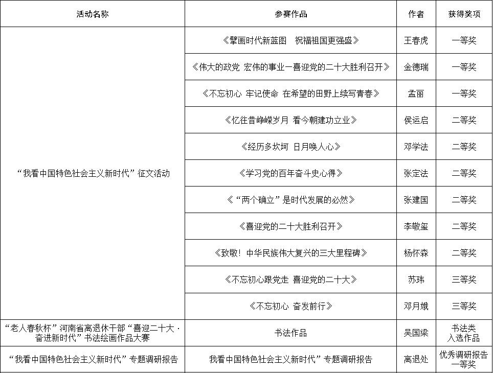 日前,接中共河南省委老干部局通报,在省委老干部局组织的“喜迎二十大·奋进新时代”系列主题实践活动中,我校共12位退休教师的征文、书法作品获奖,学校获征文活动组织工作先进单位。离退处撰写的“我看中国特色社会主义新时代”专题调研报告获评优秀调研报告一等奖。