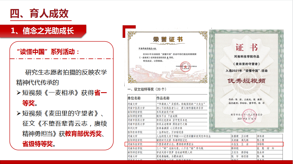近日,河南省教育厅下发了《关于公布2022年普通高等学校学生工作优秀成果获奖名单的通知》(教学〔2023〕86号)文件,我校推荐的“‘研途有你’志愿服务队”项目,经省教育厅网络评审、专家评议、现场展示、专家终审和网上公示等环节,荣获省普通高等学校2022年学生工作优秀成果二等奖。