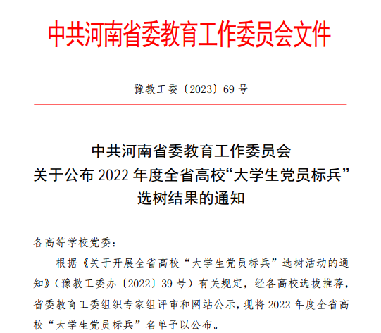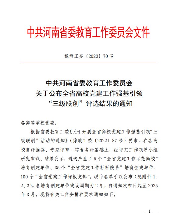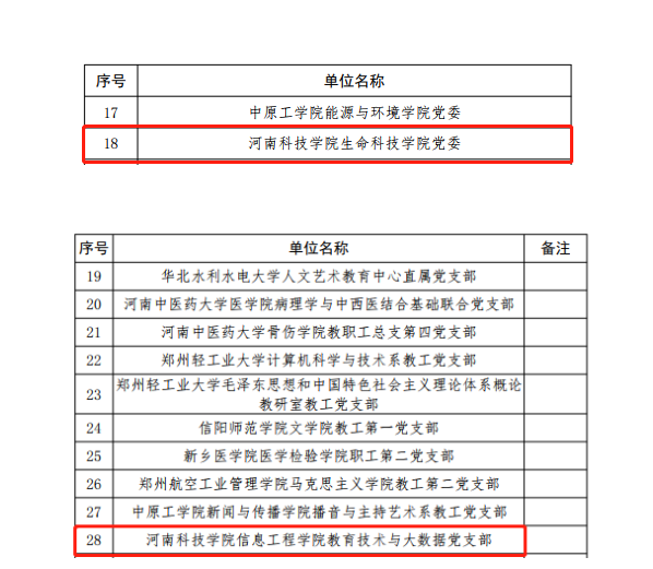 近日,省委教育工委公布了《全省高校党建工作强基引领“三级联创”评选结果的通知》,我校生命科技学院党委获批“全省党建工作标杆院系”培育创建单位,信息工程学院教育技术与大数据党支部获批“全省党建工作样板支部”,生命科技学院郭淑娜、机电学院王新宇荣获“大学生党员标兵”称号。