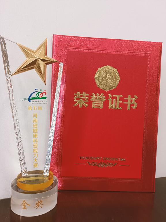 在河南省卫生健康委、河南省科技厅、河南省总工会、河南省科协、河南省疾病预防控制中心联合举办的第五届河南省健康科普能力大赛中,我校校医院执行院长李艳丽科普演讲《三剑合璧,宫颈无敌》荣获大赛“金奖”。该奖项是全省高校医护人员首次获得,也是新乡市医疗系统首次获得。颁奖仪式于6月8日在河南省疾控局举行。