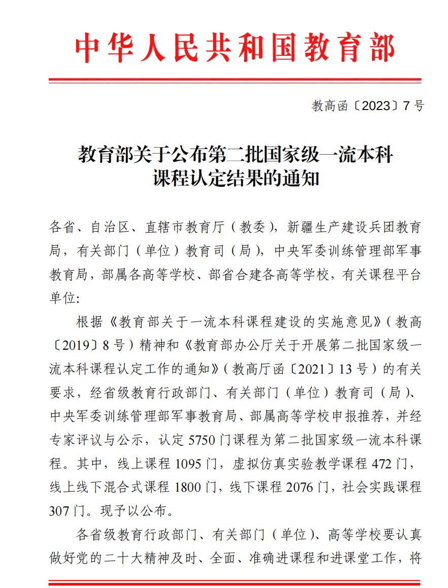 近日,教育部下发了《关于公布第二批国家级一流本科课程认定结果的通知》(教高函〔2023〕7号),我校3门课程被认定为国家级一流本科课程,分别是外国语学院王惠敏老师课程团队的《综合商务英语》、机电学院万秀颖老师团队的《工程制图》、文法学院苏喜庆老师团队的《文学概论》等3门课程。截至目前,我校共有4门课程获批国家级一流本科课程。