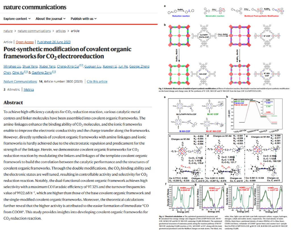 近日,我校化学化工学院(计算化学研究所)崔乘幸副教授团队与中国科学院上海高等研究院徐庆副研究员团队合作,在共价有机框架电催化CO2还原领域取得重要研究进展,成果以“Post-synthetic modification of covalent organic frameworks for CO2electroreduction”为题在《Nature Communications》上发表,崔乘幸副教授为共同通讯作者。