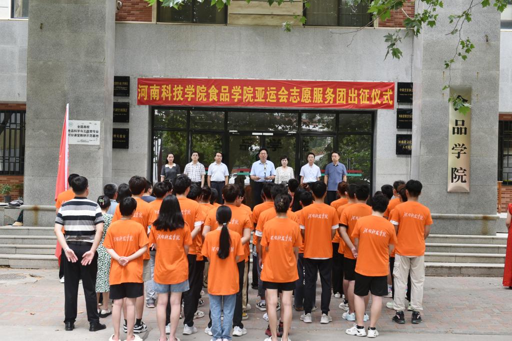 6月28日下午,我校杭州亚运会志愿服务团出征仪式在食品学院楼前举行,副校长冯启高、食品学院党政领导班子、教师代表及参加志愿服务的40名学生参加了出征仪式。出征仪式由食品学院党委主要负责人主持。