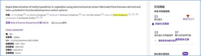 近日,Essential Science Indicators(ESI)公布最新统计数据,我校机电学院赵红远博士2篇研究论文《3D interconnected honeycomb-like ginkgonut-derived porous carbon decorated with β-cyclodextrin for ultrasensitive detection of methyl parathion》和《Rapid determination of methyl parathion in vegetables using electrochemical sensor fabricated from biomass-derived and beta-cyclodextrin functionalized porous carbon spheres》入选ESI全球TOP1%高被引论文。上述研究论文均为中国科学院一区Top期刊论文,河南科技学院为第一署名单位和通信作者单位。