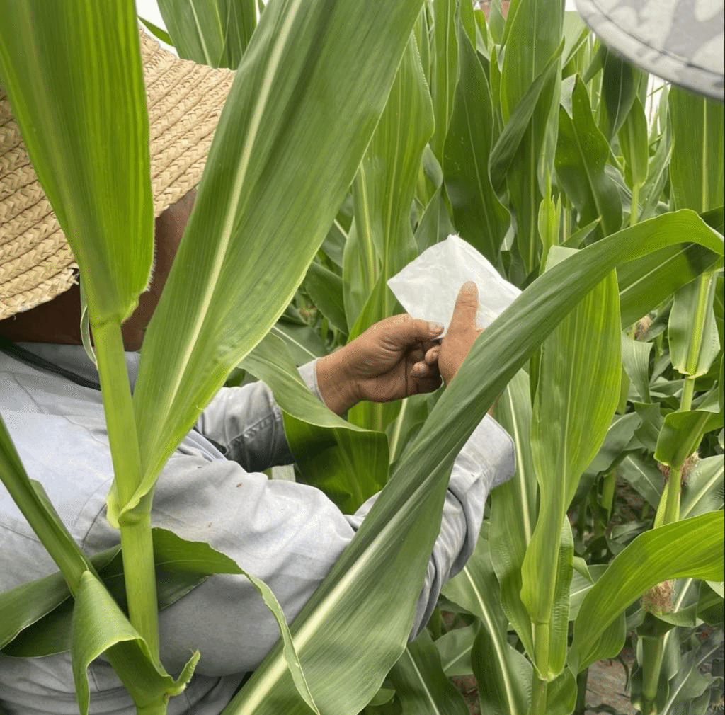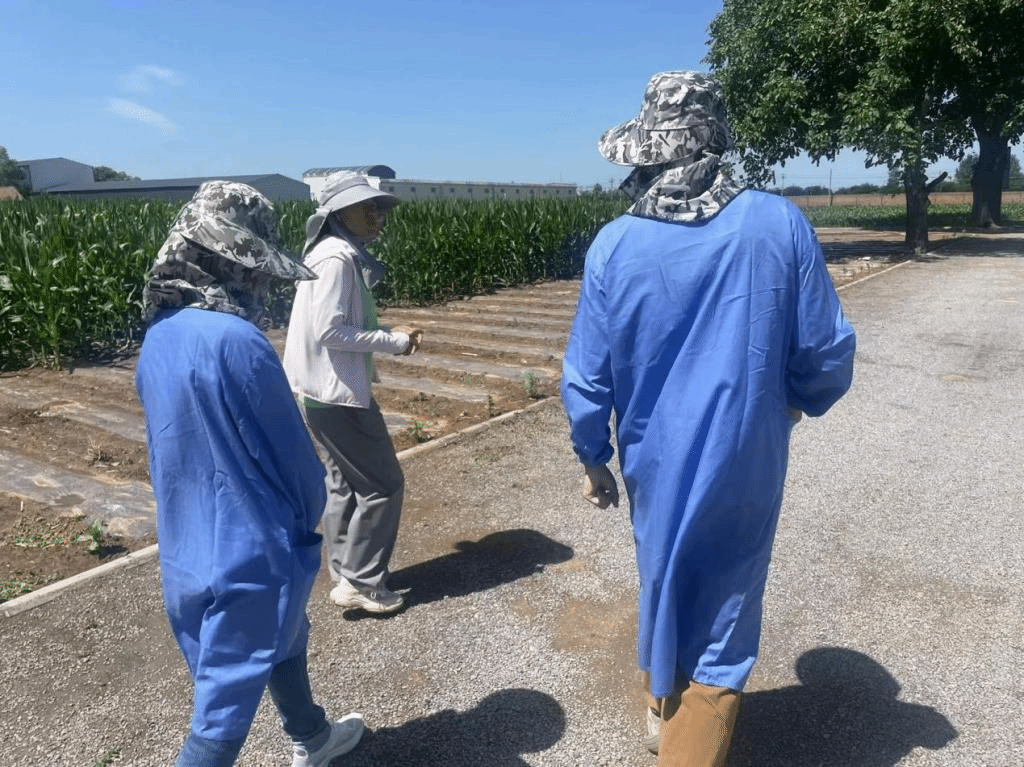 七月上旬,正值玉米育种、制种工作的关键时期,田间已有部分自交系材料抽雄孕穗,农学院实践团队队员们陆续抵达实习地种业公司各处实习基地,进行为期一个月的专业实习。学生在大豆田间进行授粉和除杂、在玉米地里进行套袋授粉操作。套袋授粉技术要考验学生的耐心和细心,套袋时要用透明塑料袋套雌穗,等雌穗花丝露出并且雄穗颖壳打开花药露出时,进行雄穗套袋工作。授粉时间由花药的散粉情况决定,花粉随采随授,结束后用大头针固定好袋子防杂,一定时间后,再用马克笔进行编号,进行套袋回收工作。降雨间歇期,需要摇去植株上的水分为散粉吐丝提供有利条件,更要注意做好病虫害防治工作。
