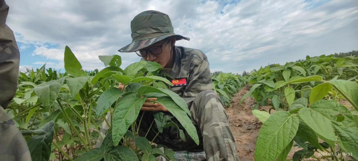 实践队员在田中对大豆进行授粉和除杂工作