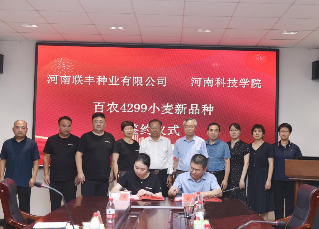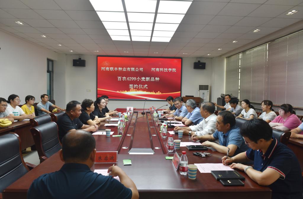 近日,我校与河南中种联丰种业有限公司在农学院708会议室举行河南科技学院和河南联丰种业有限公司联合研发小麦新品种“百农4299”小麦新品种转化签约仪式。校党委书记宋亚伟、副校长胡铁柱,河南联丰种业有限公司董事长刘丹丹,成果转化与合作办公室、农学院、小麦中心相关负责人,茹振钢教授及小麦中心团队成员参加仪式。会议由成果转化与合作办公室负责人主持。