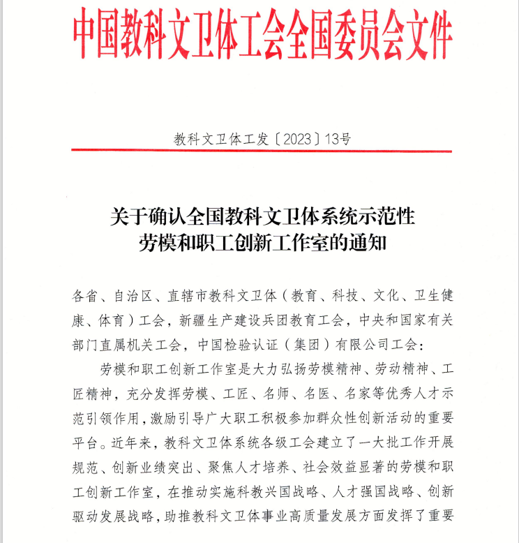 近日,中国教科文卫体工会全国委员会下发了《关于确认全国教科文卫体系统示范性劳模和职工创新工作室的通知》,由省工会、校工会支持建设,以全国先进工作者茹振钢命名的劳模创新工作室荣获全国教科文卫体系统“示范性劳模和职工创新工作室”荣誉称号。