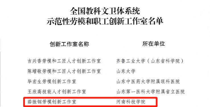 全国教科文卫体系统示范性劳模和职工创新工作室是大力弘扬劳模精神、劳动精神、工匠精神,充分发挥优秀人才示范引领作用,激励引导广大职工积极参加群众性创新活动的重要平台。本次评选的全国示范性创新工作室均在本行业中有显著影响力、创新能力卓越、创新成果显著、社会经济效益突出的劳模和职工创新工作室,河南省仅有3个工作室入选。茹振钢劳模创新工作室的成功入选实现了我校该项工作的新突破。