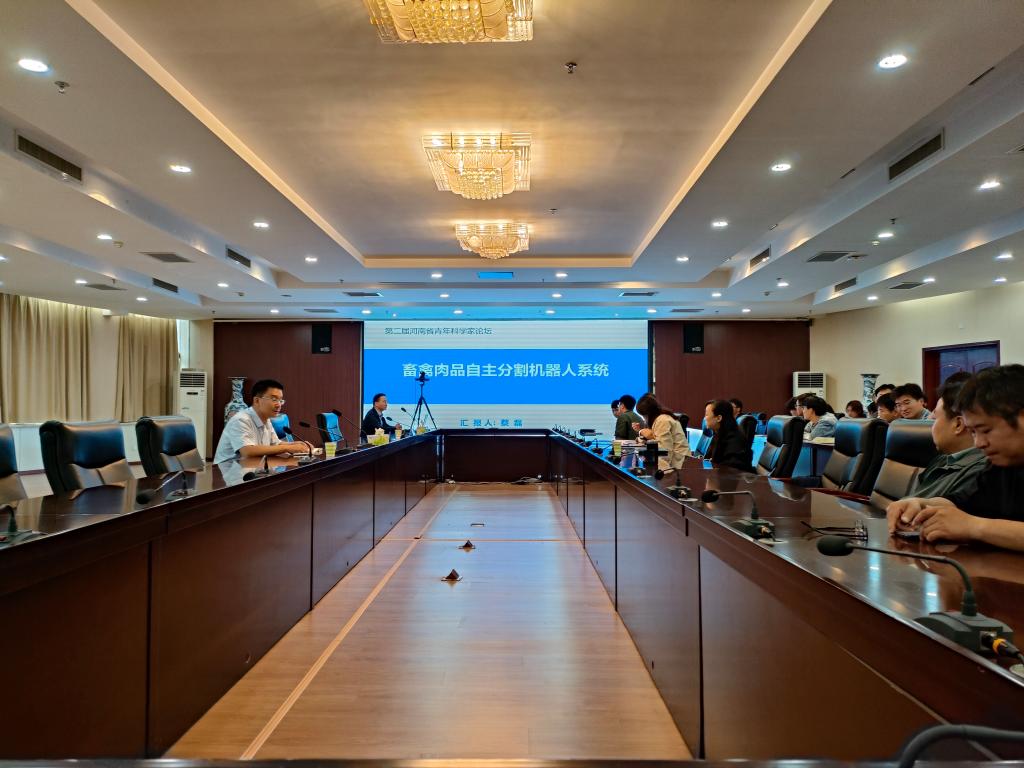 河南省政府特殊津贴专家、河南科技学院人工智能学院院长蔡磊教授以《畜禽肉品自主分割机器人系统》为题,对科研团队依托国家重点研发计划在畜禽类肉品自主分割机器人系统精准扫描、快速自主剔骨、肉品追溯等方面取得的研究成果进行了详细讲解,重点展示了自主搭建的生产示范线运行情况,并简要介绍了团队近期围绕高端肉品品质管控、精细化分拣、差异性包装等方面的科研进展情况。